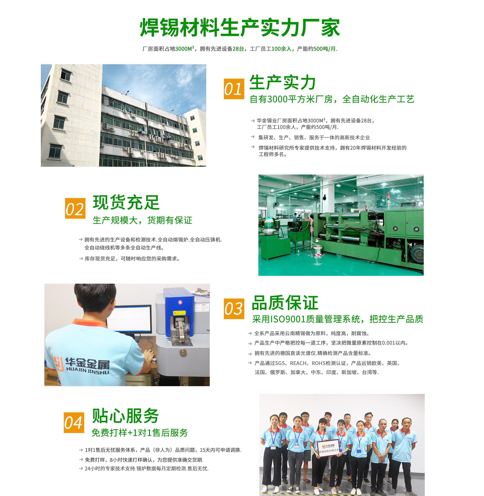華金錫業(yè)有限公司一家資深的專業(yè)焊錫制品生產(chǎn)廠家,多年專注焊錫制品生產(chǎn)加工。產(chǎn)品有無鉛錫絲.無鉛錫條.錫板.錫膏.錫珠等.公司憑借多年的經(jīng)驗和不斷的科技創(chuàng)新.生產(chǎn)的產(chǎn)品各項技術(shù)性能均達到國家標(biāo)準(zhǔn).歐盟標(biāo)準(zhǔn)。并獲得眾多使用廠家的肯定.為適應(yīng)環(huán)保要求.本公司2003年巨資投入生產(chǎn)無鉛焊錫,多年來連續(xù)通過SGS環(huán)保認(rèn)證.產(chǎn)品規(guī)格齊全,使用性能極佳。客戶群體遍布全國各地及國外用戶。華金錫業(yè)焊錫制品是選用一線品牌作為原材料,采用選進的配方,精工制作各種規(guī)格不同的型號,再采用全自動流水線作業(yè)擠拉成各種符合要求的焊錫絲和焊錫條。華金牌焊錫制品以其一流的品質(zhì),真誠的服務(wù),產(chǎn)品銷往全國各地,深受廣大用戶的高度贊揚。
